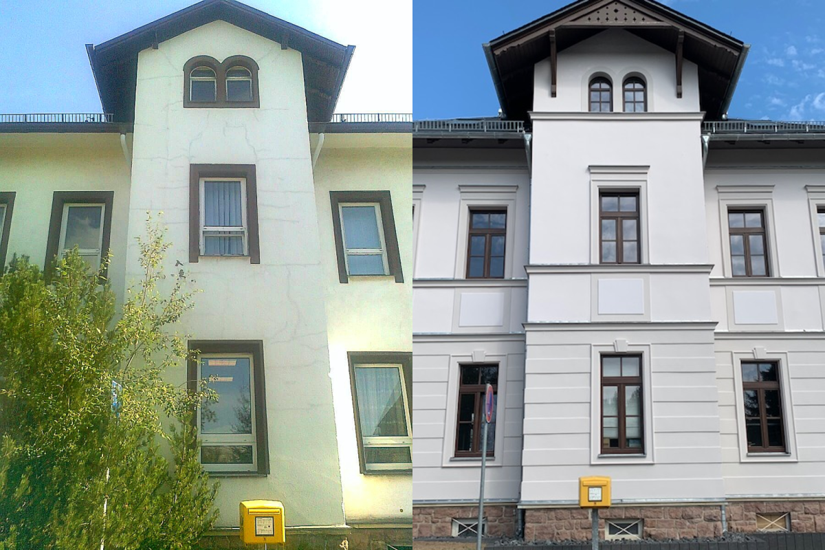 Unsanierte (links) und erneuerte (rechts) Fassade des Verwaltungsgebäudes.