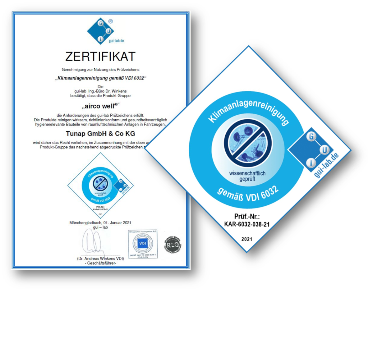 gui-lab bestätigt mit der Verwendung von airco well® die Erreichung der „Klimaanlagenreinigung gemäß VDI 6032“.