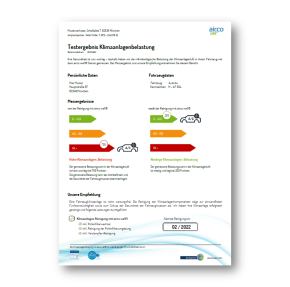 - Der zweite Wert zeigt das Messergebnis nach dem Klimaservice mit airco well®.