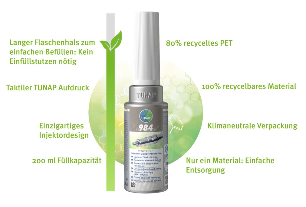 Die neue Verpackung bietet sowohl dem Anwender als auch der Umwelt mehrere Vorteile. Mit Blick auf die Anwendung ist die TUNBottle viel einfacher zu handhaben. Es ist kein zusätzlicher Einfüllstutzen erforderlich, eine saubere Befüllung sowie eine Geruchsverhütung nach dem Gebrauch werden durch das einfache Wiederverschließen der Flasche gewährleistet. Darüber hinaus kann der Anwender die Verpackung einfach recyceln, indem er sie dem dualen System (Kunststoffabfall) zuführt.